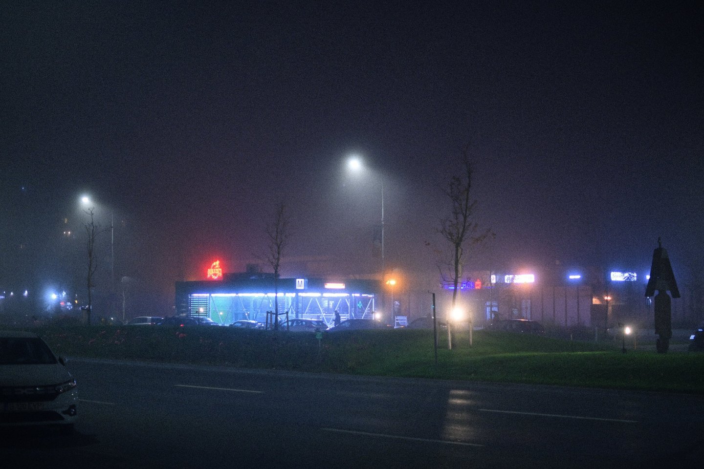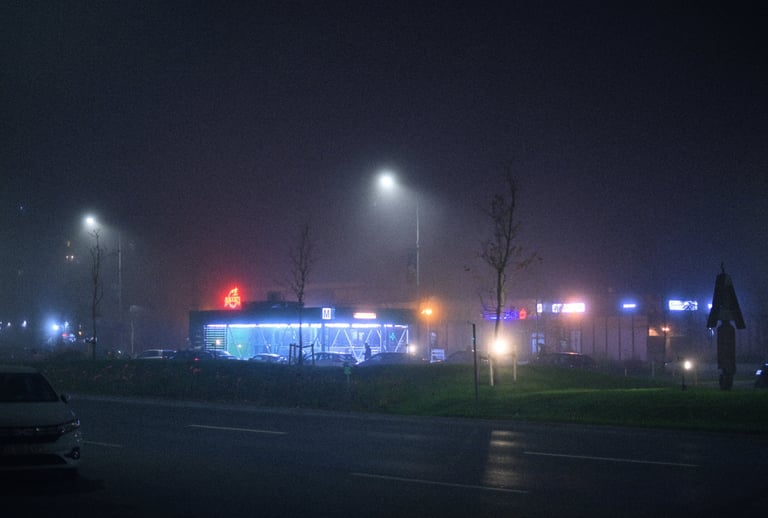 Reduced clarity creates bloom around streetlights, enhanced contrast keeps blacks rich and inky, and a controlled white balance with amber and magenta shifts adds warmth to highlights while introducing subtle purple tones in the shadows. Slight underexposure and optional high-ISO grain complete the authentic nighttime Kodak Gold aesthetic.